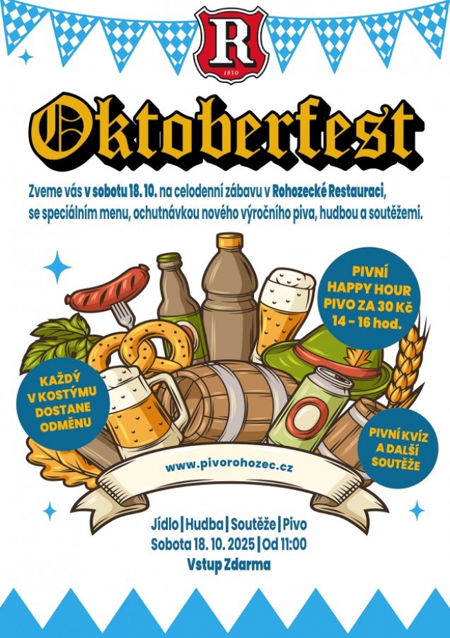 Pivovar Rohozec vás srdečně zve na OKTOBERFEST v Rohozci, který proběhne v sobotu 18. října 2025 přímo v Rohozecké restauraci. Čeká vás den plný piva, dobrého jídla, soutěží a hudby.